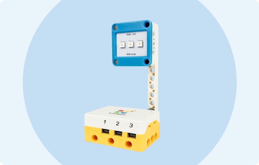 - RGBランプで信号機を作ります。点灯時間や点灯回数を設定したとおりに繰り返すプログラミングをします。