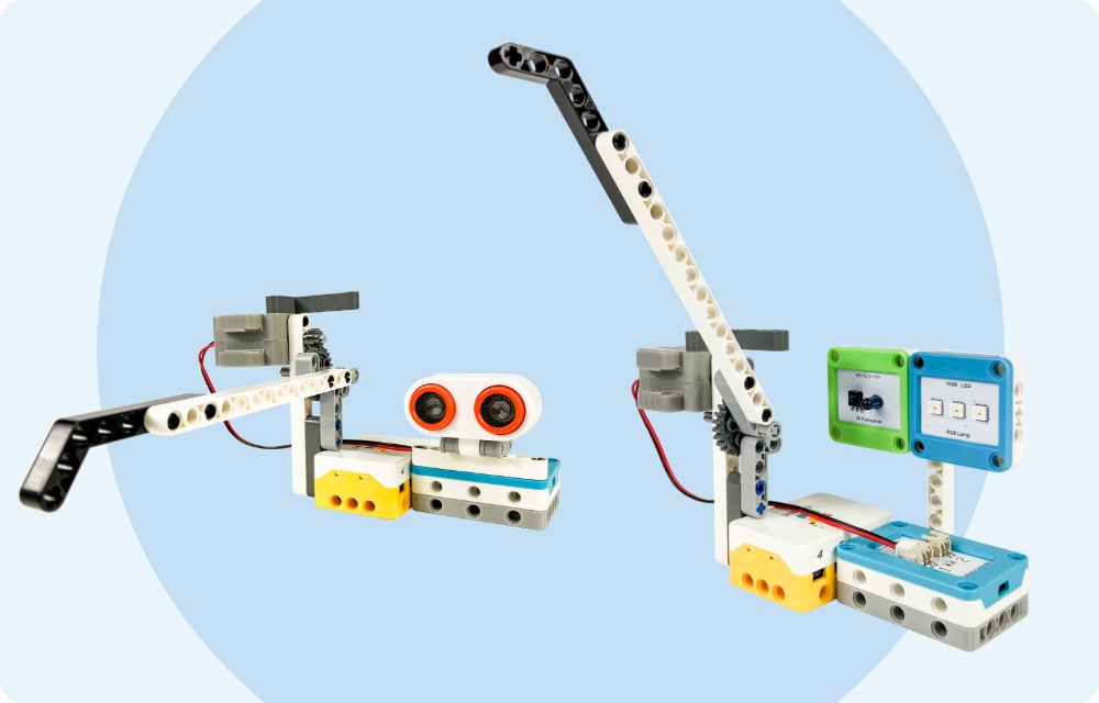 - 第5回の動くゲートを改造します。リモコンで開いたり閉じたりできるようにして、RGBランプも組み合わせます。
