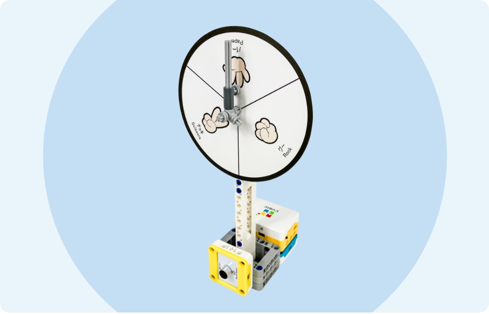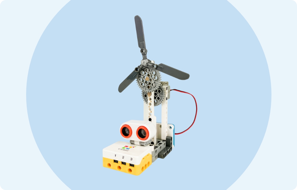 - ギアで増速させた扇風機を作ります。「設定した速度まで徐々に回転速度が上がっていく」を繰り返すプログラミングをします。