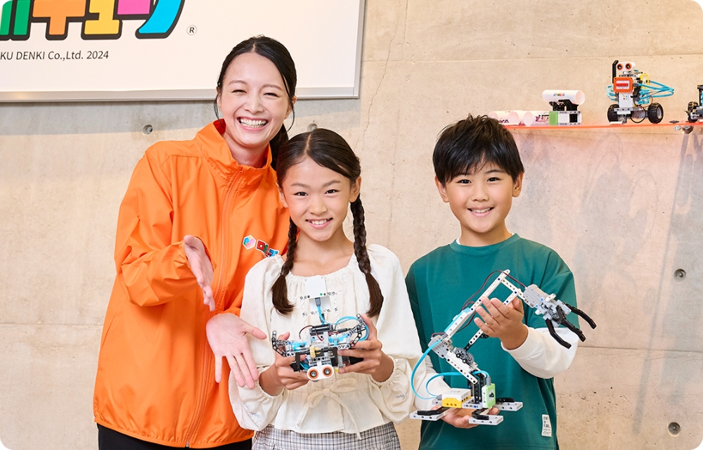 電子ブロックを取り入れたロボットの製作と、プログラミングを学びます。生活の中でも使われている機械が動く仕組みや、センサー、プログラミングについて楽しみながら学び理解します。