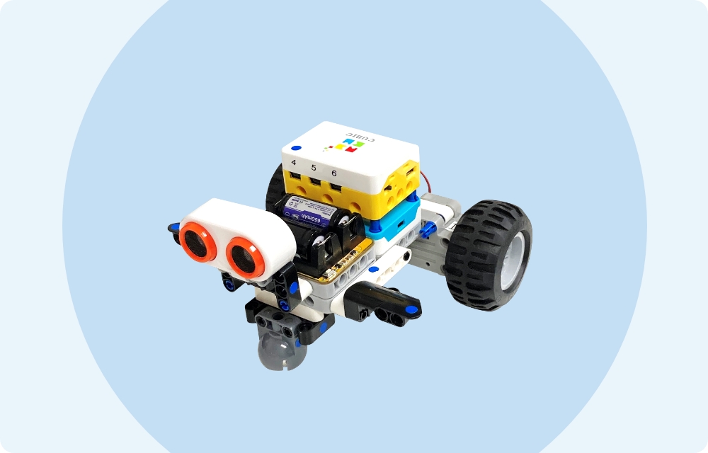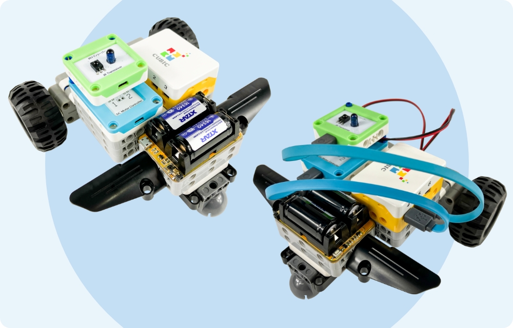 - リモコンで「前進」「停止」を操作する車を作ります。モーターの動きとタイヤの回転を理解するカリキュラムです。