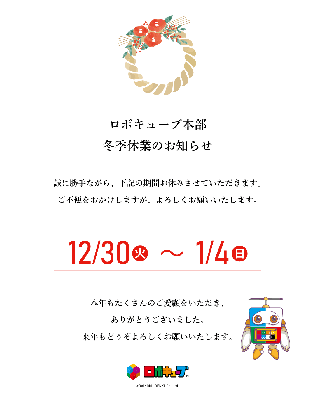ロボキューブ本部では、誠に勝手ながら下記の期間を年末年始休業とさせていただきます。