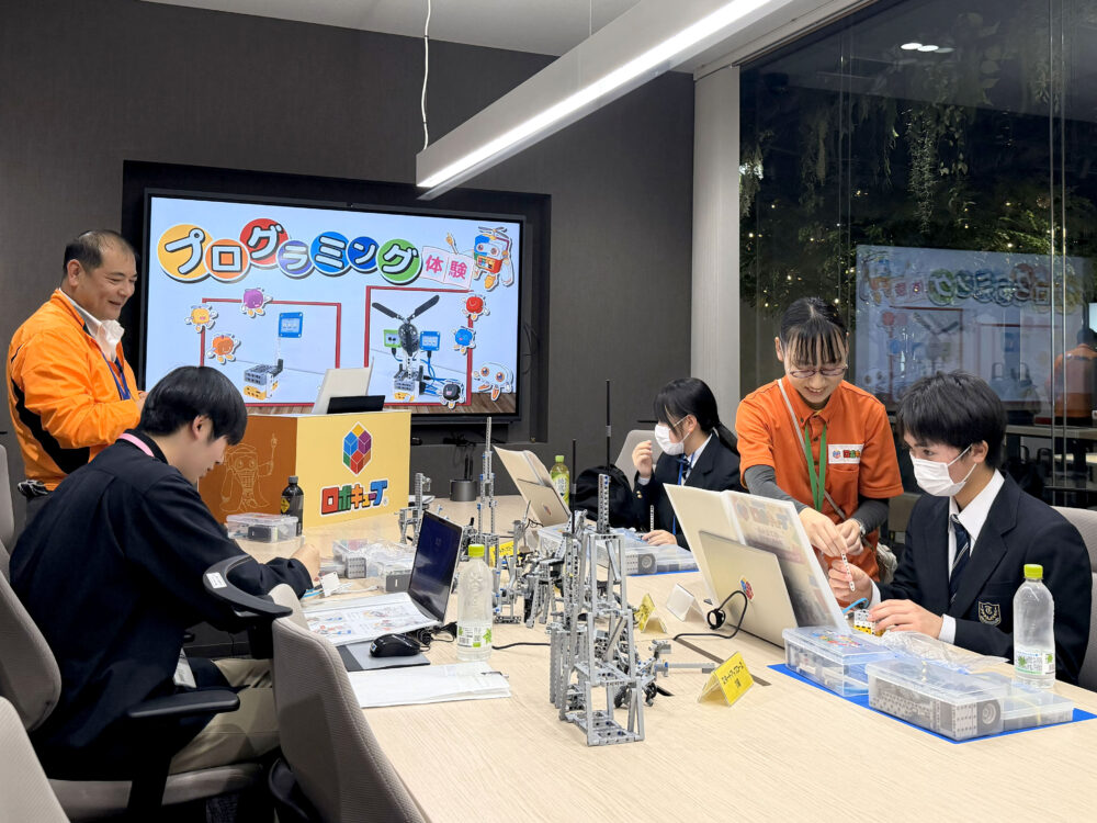 ロボキューブでの職場体験では、まず「信号機と扇風機」のロボットプログラミング体験からスタート。
