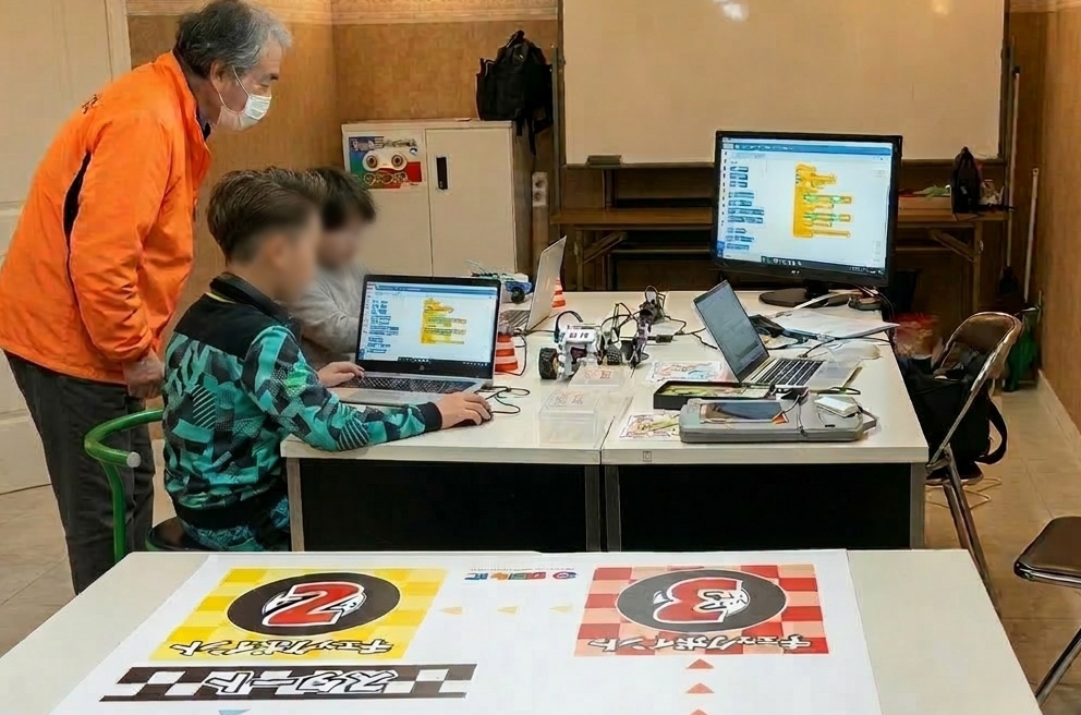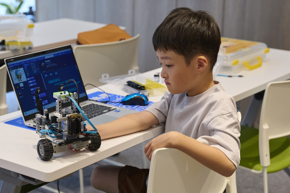 スタートアップコースは低学年向けのトレーニングプログラムです。プログラミングはタブレットを使い、ブロックを組み立て、身近な動きや仕組みを体験的に学びます。はじめてでも安心して取り組める内容で、ものづくりの楽しさと発見を感じられるコースです。コース修了後はエントリーコースへのステップアップを目標とします。